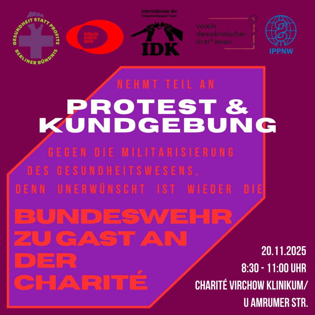Vom 20. - 22.11.25 findet an der Charité das Symposium „Zivile Notfall- und Rettungsmedizin im Bevölkerungsschutz“ statt, bei dem es auch um die Einbindung, Vorbereitung und Unterwerfung des Gesundheitssystems unter militärische Erfordernisse geht.