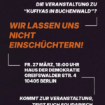 - 27. März 18 Uhr, Berlin, Haus der Demokratie: Der Schwur von BuchenwaldEin Panel zur Erinnerungspolitik zwischen Staatsräson, Völkermord und Antifaschismus. Es sprechen Mitglieder der VVN-VdA, des ELSC und der Jüdischen Stimme.