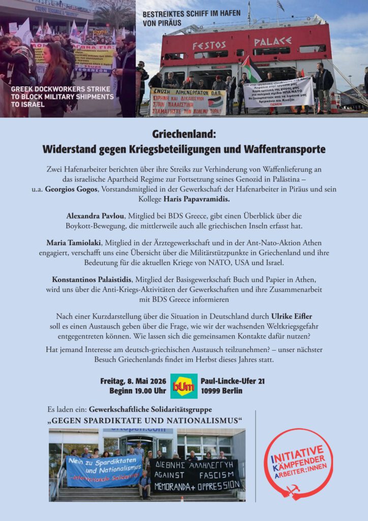 - IG-Metall-Kolleginnen und Kollegen bei Volkswagen: Nein zum Umbau auf Kriegswirtschaft!Uns erreichte folgende Mitteilung über eine Petition von IG-Metall-Kolleginnen und Kollegen bei VW: “Anläßlich der Ostermärsche 2026, möchten wir uns gerne zu Wort melden. Als Metaller*innen bei Volkswagen ist es uns wichtig, darauf hinzuweisen, dass sich Widerstand gegen den Umbau zur Rüstungsindustrie rührt. … Weiterlesen