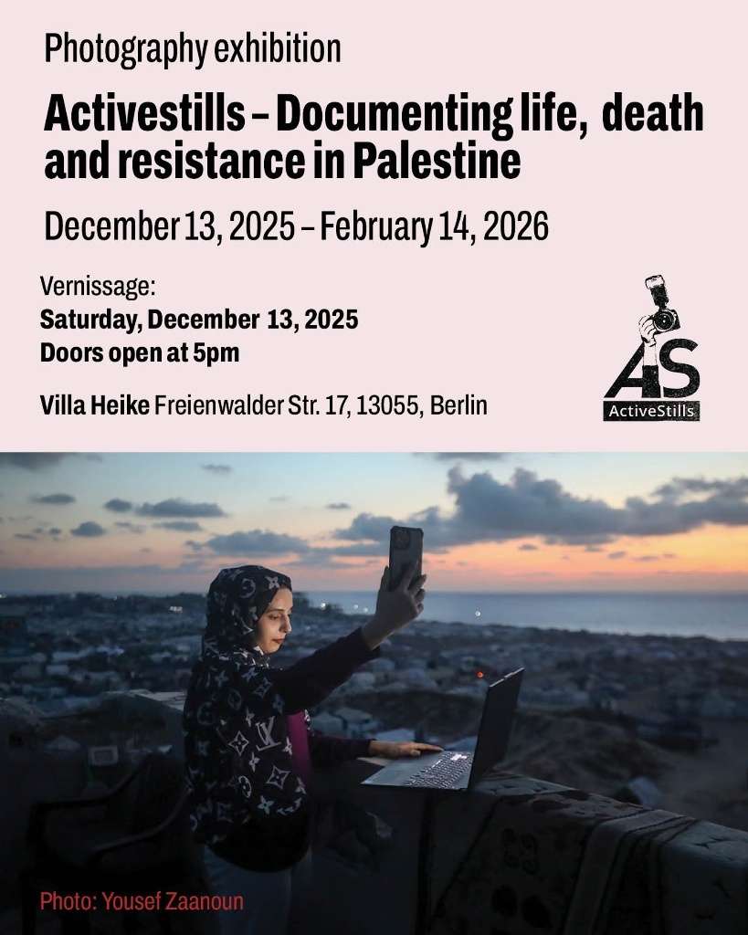 Am 13. Dezember 2025 wurde in Berlin die Ausstellung “Activestills – Documenting life, death and resistance in Palestine!” eröffnet, diese geht bis zum 14.02.2026