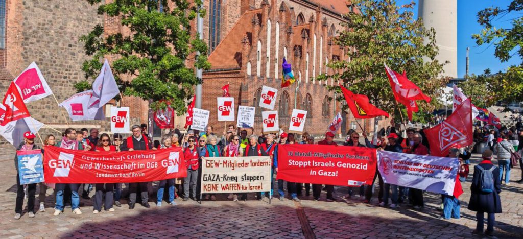 Über 200 Organisationen rufen auf. Die Gewerkschaften dürfen nicht außen stehen. Schaut, wie entschieden die italienischen Gewerkschaften inzwischen handeln. Das Forum gewerkschaftliche Linke Berlin ruft alle Gewerkschafterinnen und Gewerkschafter auf: Nehmt an dieser Demonstration teil. Kommt am Freitag, den 3. Oktober um 12:30 Uhr zum gewerkschaftlichen Block, Treffpunkt: Gegenüber dem August Bebel Platz, Haupteingang der Humbold – Universität:
