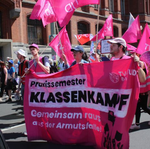“Heute sind wir mit tausenden Menschen auf der DGB-Demonstration auf die Straße gegangen. Gemeinsam haben wir uns laut und deutlich für kämpferische Gewerkschaften positioniert. Der DGB-Führung war dies ein Dorn im Auge. Bereits früh haben sie den klassenkämpferischen Block kriminalisiert, da er sich in ihren Augen zu klar gegen Krieg, das Morden in Palästina und für kämpferische Auseinandersetzungen mit dem Kapital positioniert hat.
