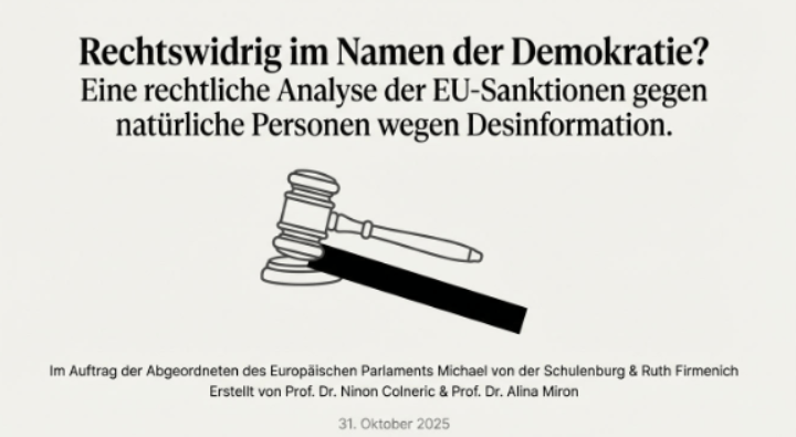 Im EU-Parlament gab es am 11. November eine Anhörung zur rechtlichen Bewertung der Sanktionierung von Journalisten durch den Europäischen Rat. Laut der einhelligen Meinung der dort vortragenden Rechtswissenschaftler verstößt das aktuelle EU-Sanktionsregime gegen Einzelpersonen wegen angeblicher „Desinformation“ in zahlreichen Punkten gegen EU- und Völkerrecht. Die Maßnahmen seien rechtlich fehlerhaft, unverhältnismäßig und nicht mit den Grundrechten vereinbar.