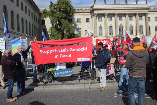 PS: unter den vielen unorganisierten Mitdemonstranten waren auch etliche Kolleg:innen aus unseren Betrieben. Einige sprachen uns direkt an. Sie fanden es ziemlich toll, dass sich auch IG Metaller:innen öffentlich gegen die „Schweinerei in Gaza“ aussprechen! Wen wundert das, wenn 80 Prozent der Menschen in Deutschland das Vorgehen Israels ablehnen! Die Mitglieder:innen sind es nicht, die auf der Bremse stehen.