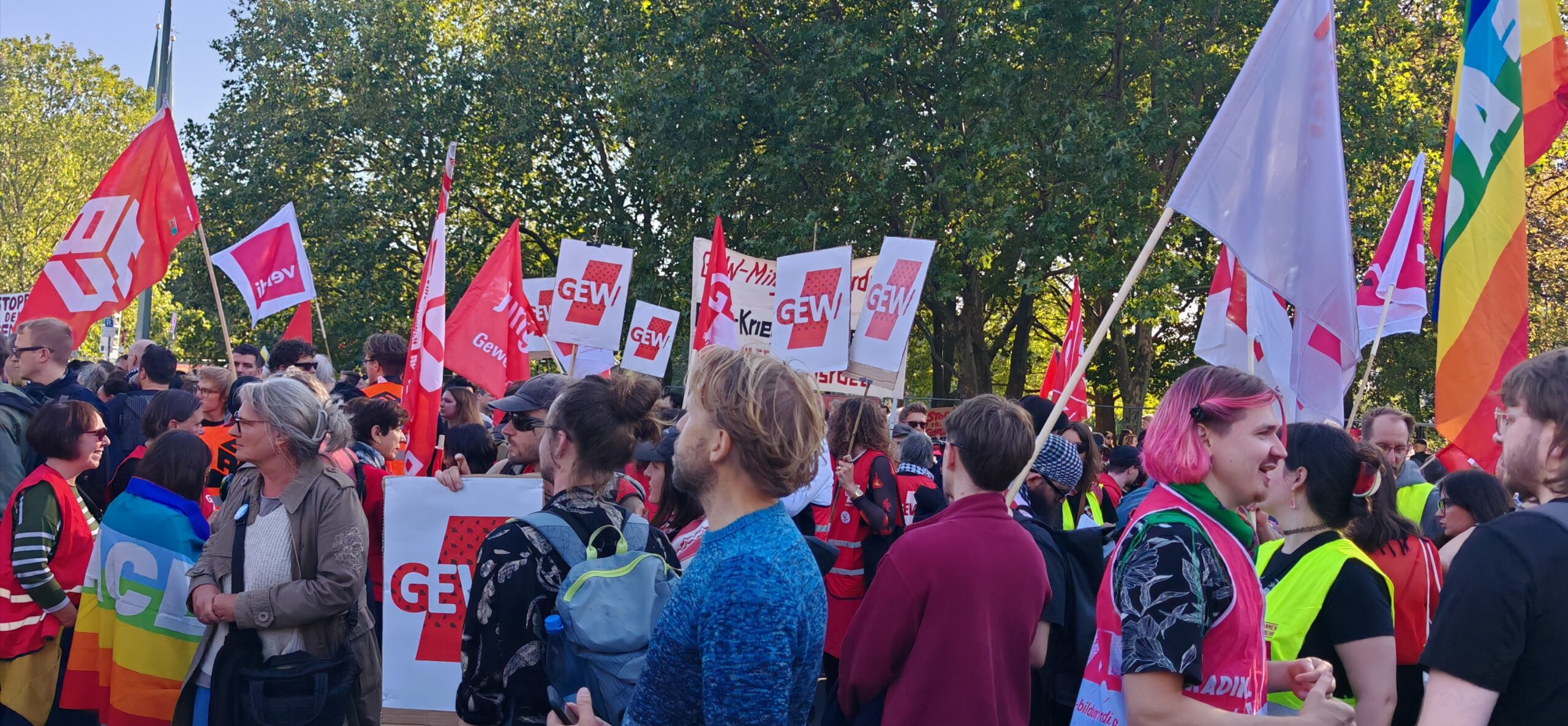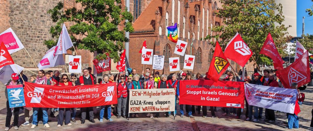 Mitglieder von GEW, Verdi und IG Bau, Gewerkschafter:innen4Gaza, German Healthcare Workers For Palestine, Forum Gewerkschaftliche Linke Berlin, Arbeitskreis Internationalismus Metaller:innen Berlin und viele weitere Gewerkschafter:innen – u.a. aus Logistik und Servicebereichen wie Lieferando – bildeten einen eindruckvollen Berliner Gewerkschaftsblock. Sie hatten sich vernetzt: „Machen wir mit einem eigenen gewerkschaftlichen Block deutlich sichtbar, dass Gewerkschafter:innen sich mit den Menschen in Gaza solidarisieren und endlich Konsequenzen fordern!“ „Solidarität gehört zur gewerkschaftlichen DNA. Internationale Solidarität – hier und heute besonders gegen die Barbarei in Gaza – gehört zum Rückgrat gewerkschaftlicher Kämpfe. Wir lassen unsere ausländischen Kolleg:innen nicht im Stich. Einer für Alle und Alle für Einen.“ Ein Ver.di Kollege hatte es auf den Punkt gebracht: „Internationale gewerkschaftliche Solidarität – wenn nicht hier! Kampf gegen Rechts und Faschismus – wenn nicht hier! Kampf gegen Aufrüstung und Krieg – wenn nicht hier!“ „Besonders die Mobilisierung der GEW war toll.“