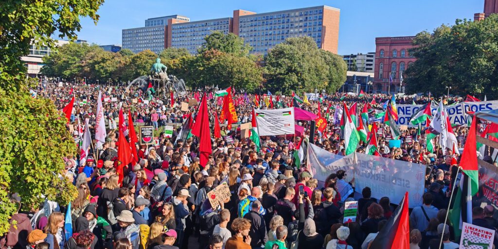 Von der Auftaktkundgebung am Roten Rathaus bis zur Kundgebung am Großen Stern waren es laut Veranstalter schließlich mehr als 100 000, die der Ablehnung des Massenmordens durch den israelischen Staat und seiner Unterstützung durch die deutsche Regierung laut und deutlich auf der Straße Gehör verschaffen wollten.