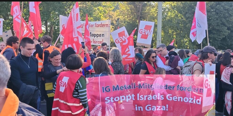 PS: unter den vielen unorganisierten Mitdemonstranten waren auch etliche Kolleg:innen aus unseren Betrieben. Einige sprachen uns direkt an. Sie fanden es ziemlich toll, dass sich auch IG Metaller:innen öffentlich gegen die „Schweinerei in Gaza“ aussprechen! Wen wundert das, wenn 80 Prozent der Menschen in Deutschland das Vorgehen Israels ablehnen! Die Mitglieder:innen sind es nicht, die auf der Bremse stehen.