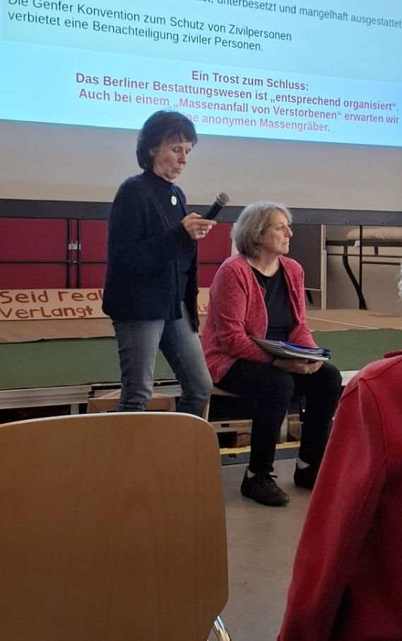 Der Vortrag wurde beendet mit einem „Trost“ aus dem Rahmenplan: Das Berliner Bestattungswesen ist „entsprechend organisiert“: Auch bei einem „Massenanfall von Verstorbenen“ seien daher keine anonymen Massengräber zu erwarten.